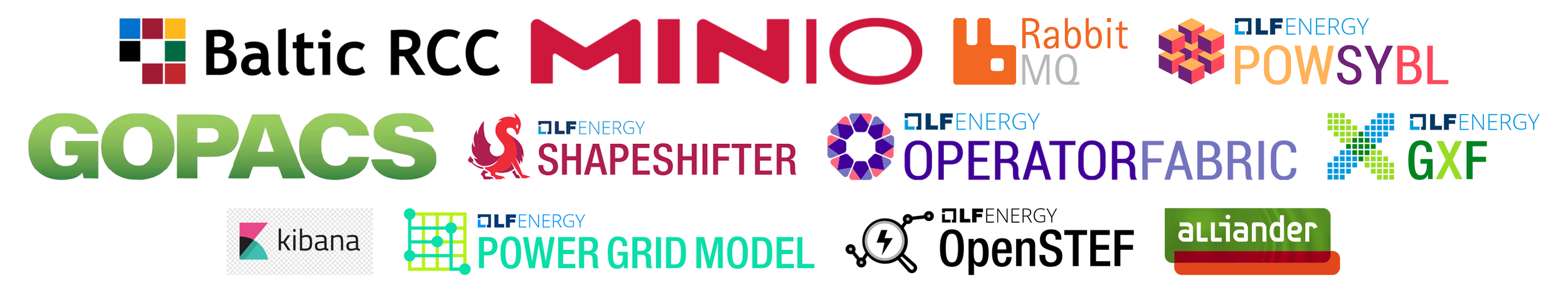 Open-source tools: OpenSTEF, Power Grid Model, Grid eXchange Fabric (GXF), OperatorFabric, Shapeshifter, GOPACS, PyPowSyBl, RabbitMQ, MinIO, Kibana