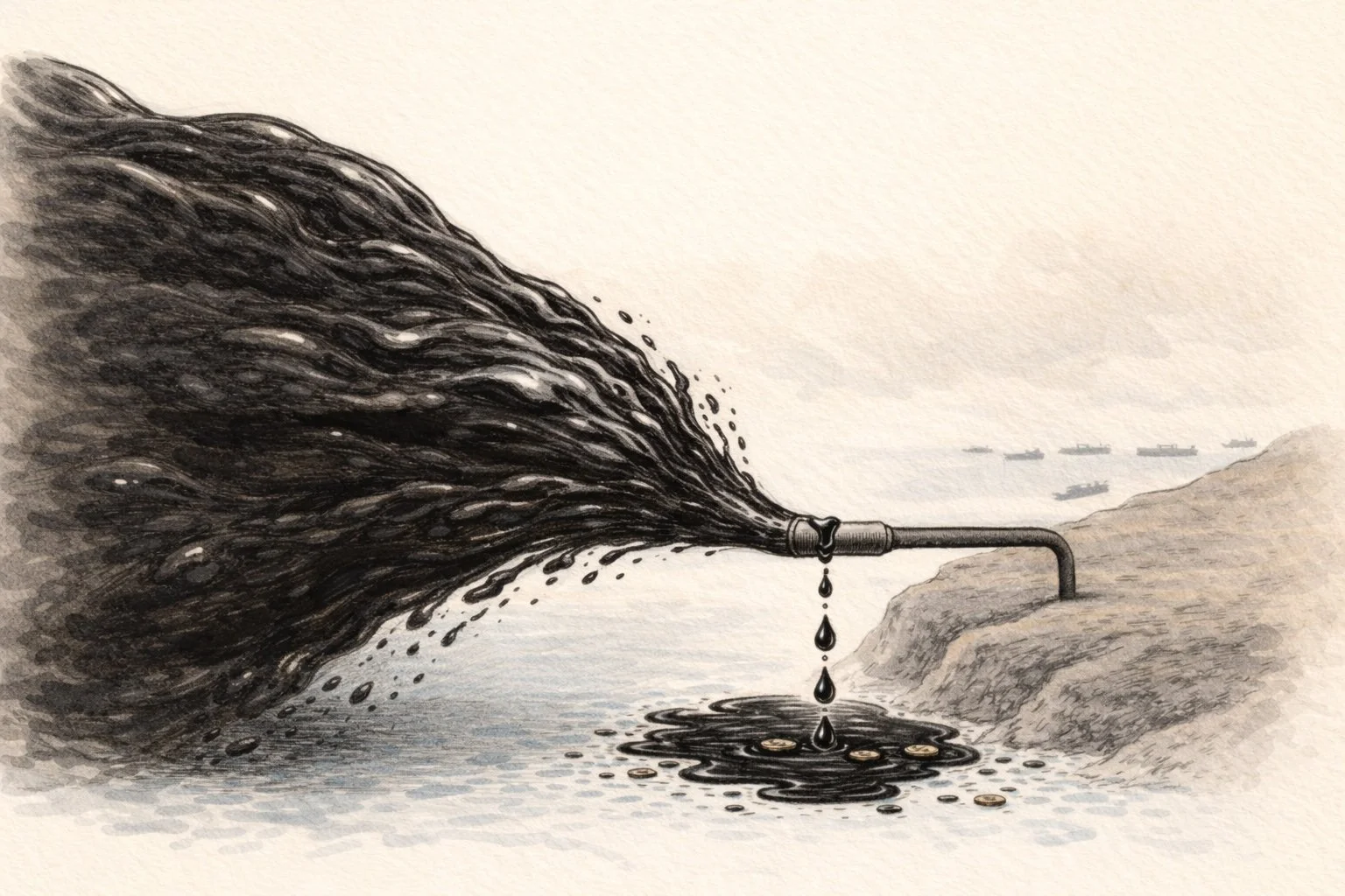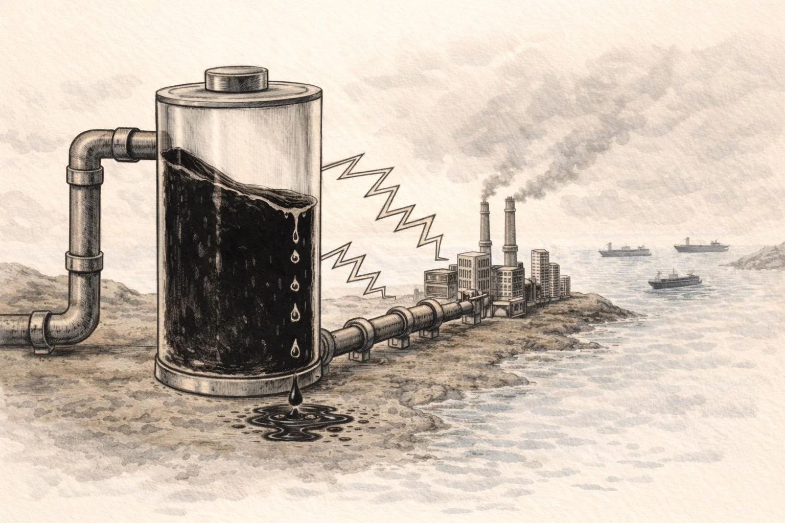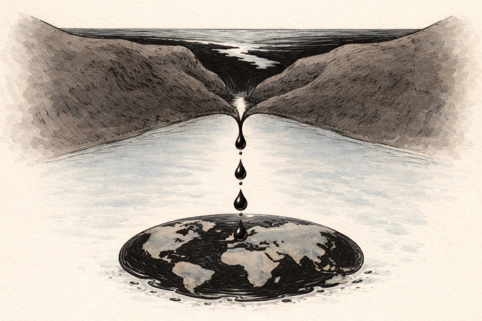 This illustration shows how the global energy system depends on a single narrow chokepoint—the Strait of Hormuz—where a vast flow of oil passes through a corridor barely wider than a thread. The artery-like passage conveys how geopolitical tension, maritime security, and infrastructure constraints converge in one fragile space, highlighting that global energy stability is shaped not by supply alone, but by the resilience of the narrow pathways that move energy through the world economy.