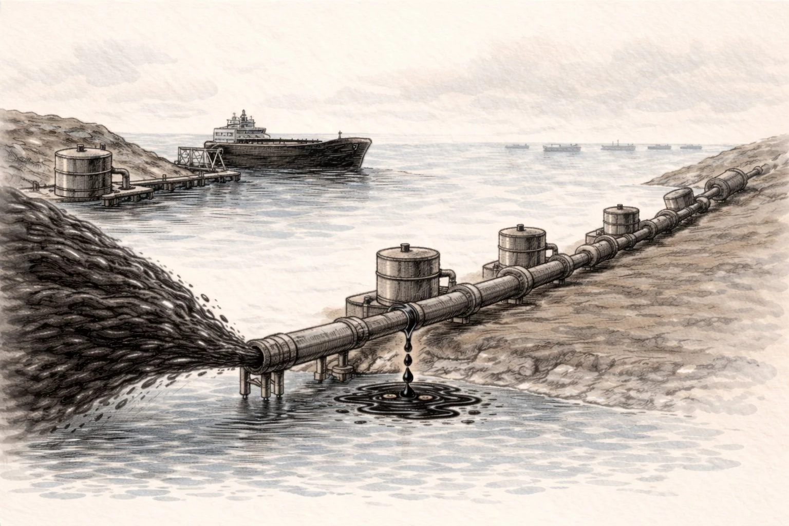 • Physics: Pipelines are the most efficient way to move large oil volumes on land. Once built, they provide steady, continuous flow and avoid repeated ship-to-ship or ship-to-terminal transfers. But the pipe alone is not enough: to sustain multi-million-barrel-per-day throughput, you also need feeder lines, pumping stations, storage, marine export terminals, berths, metering, blending, and security. The physics are favorable, but only when the whole corridor is built end-to-end.