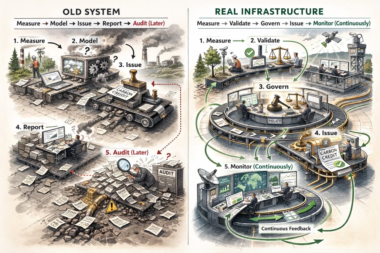 This illustration contrasts two visions of carbon market infrastructure: on the left, a fragmented “carbon factory” where measurement feeds opaque models, credits are issued quickly, and problems are only discovered through messy audits after the fact; on the right, a true carbon control system where measurement flows through continuous validation, embedded governance, disciplined issuance, and real-time monitoring, creating a closed feedback loop that detects risk, enforces integrity, and aligns markets with real environmental outcomes rather than delayed paperwork.