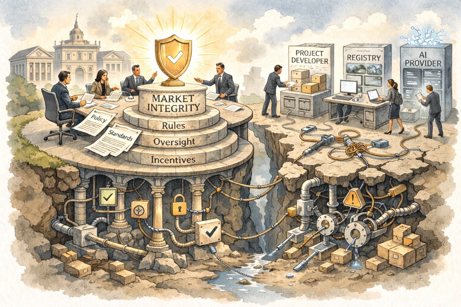 This illustration shows two contrasting visions of carbon market governance: on one side, integrity rests on a clearly structured foundation of rules, oversight, and aligned incentives; on the other, fragmented actors operate through disconnected systems built over unstable ground. The chasm between them symbolizes the institutional gap that technology alone cannot bridge. Without clear ownership of baseline realism, methodology evolution, and enforcement authority, even the most advanced software remains layered atop foundations that determine whether markets ultimately earn or erode trust.
