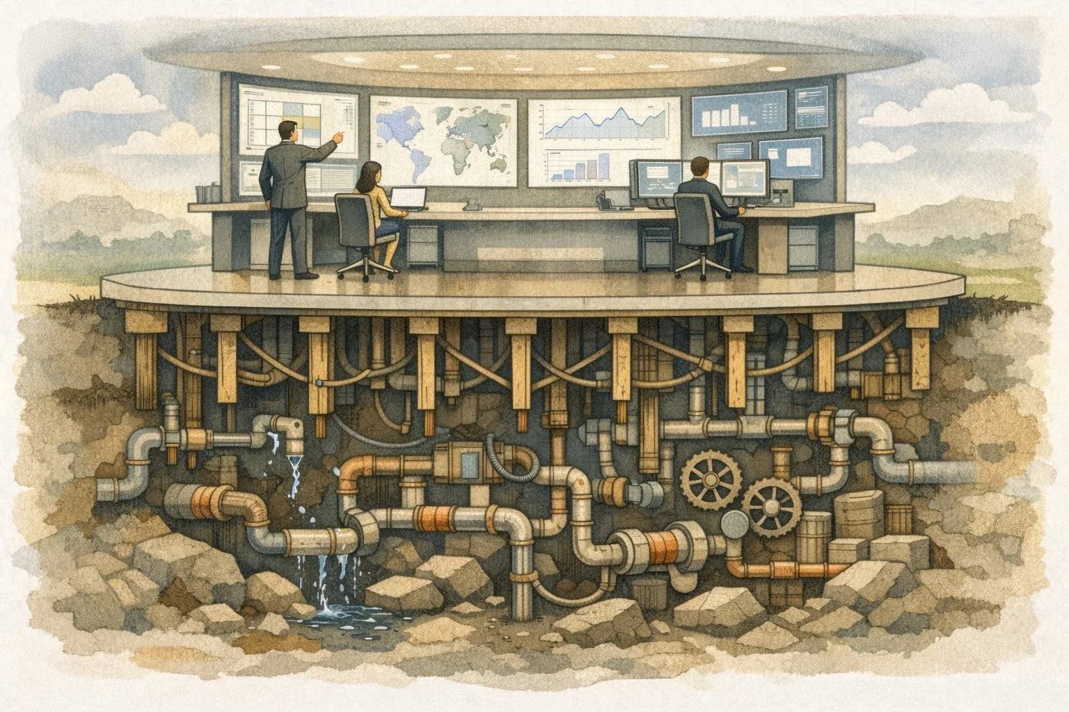 This illustration shows a polished, data-rich dashboard environment where professionals confidently manage carbon metrics above ground, while beneath the surface a tangled, fragile web of pipes, gears, and leaking systems struggles to hold everything together. The calm efficiency of the visible interface contrasts sharply with the unstable infrastructure below, symbolizing how modern carbon platforms prioritize sleek reporting and workflow automation while neglecting the deeper integrity architecture required to govern verification, risk, and trust at market scale.