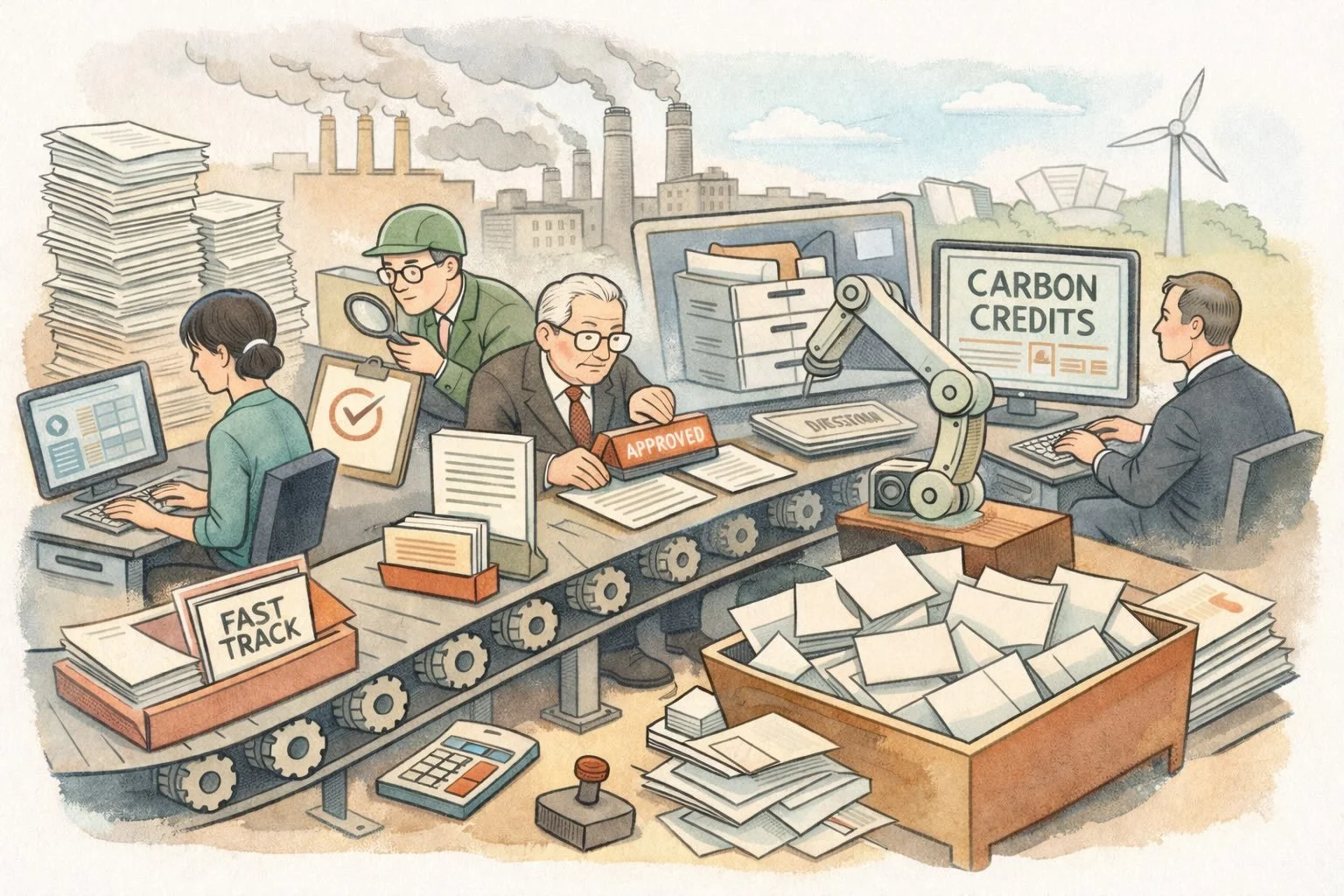 This illustration shows carbon market technology as a high-speed assembly line, where documents, approvals, and automated calculations move efficiently through digital workflows while deeper questions of environmental integrity remain outside the system, highlighting how today’s platforms optimize process and throughput without redesigning the underlying architecture of trust.