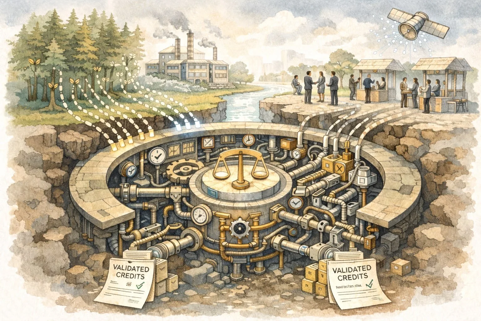 This illustration shows what seems like an integrity engine beneath the surface of carbon markets, where real-world environmental data flows through multiple verification channels before converging inside a central governance machine that transforms raw inputs into validated credits, emphasizing that trust is not created by reporting alone but engineered through continuous oversight, interconnected systems, and institutional checks that operate quietly yet decisively below the visible marketplace.