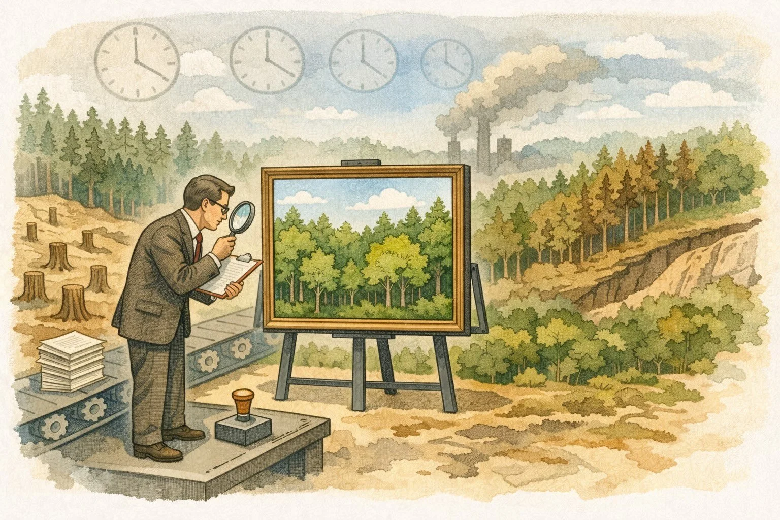 This illustration shows an auditor carefully inspecting a single, pristine snapshot of forest health while the broader landscape quietly degrades around it, symbolizing how carbon verification systems rely on periodic, narrow reviews rather than continuous, system-wide oversight. The framed scene represents compliant documentation and approved evidence, while the surrounding deforestation, smoke, and erosion reveal risks that remain invisible between audits, highlighting how procedural verification can miss slow-moving but structural integrity failures as markets scale.