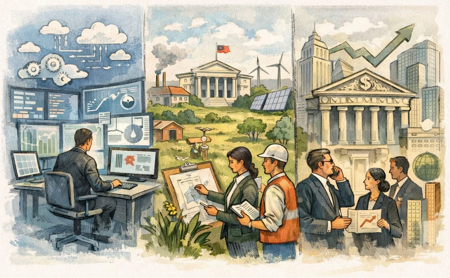 This illustration shows how carbon markets are shaped by three interconnected layers—digital software systems translating data into action, national institutions turning climate policy into real-world implementation, and financial market infrastructure scaling climate outcomes through capital, governance, and risk management—highlighting that true credibility depends not on any single layer, but on how all three work together as a unified system of trust.
