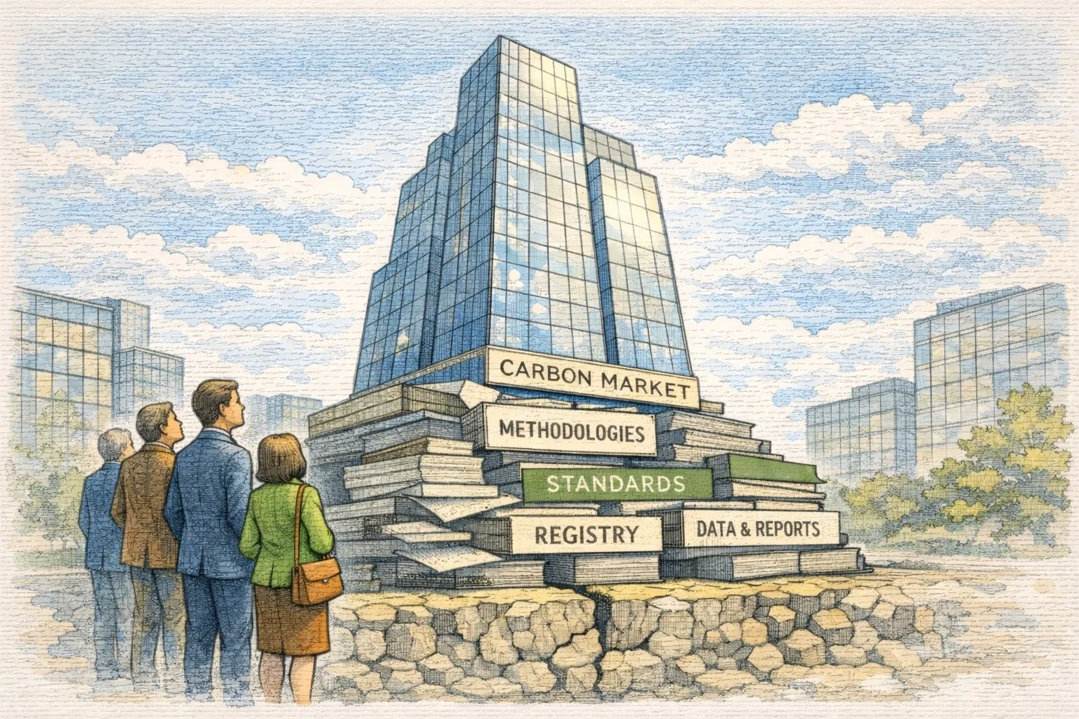 This illustration shows a gleaming carbon market rising skyward but its foundations are built on stacked paper systems of methodologies, standards, registries, and reports, quietly revealing how today’s climate finance architecture rests on fragile documentation rather than real-time, verifiable infrastructure.