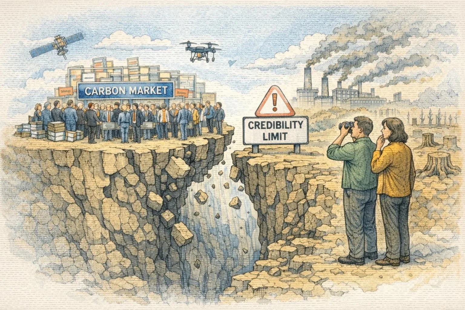 The illustration depicts a crowded carbon marketplace racing toward the edge of a crumbling cliff, where booming transactions and expanding participation continue uninterrupted, even as the ground beneath them fractures and falls away. Across the widening gap, a warning sign marks the approaching limits of credibility, watched by observers who can already see the environmental damage accumulating in the distance. Satellites and drones hover overhead, symbolizing modern monitoring tools that expand visibility but cannot repair structural weakness. The scene captures how carbon markets have scaled rapidly in volume and sophistication while trust, integrity, and governance struggle to keep pace—revealing a system growing faster than its foundations can support.