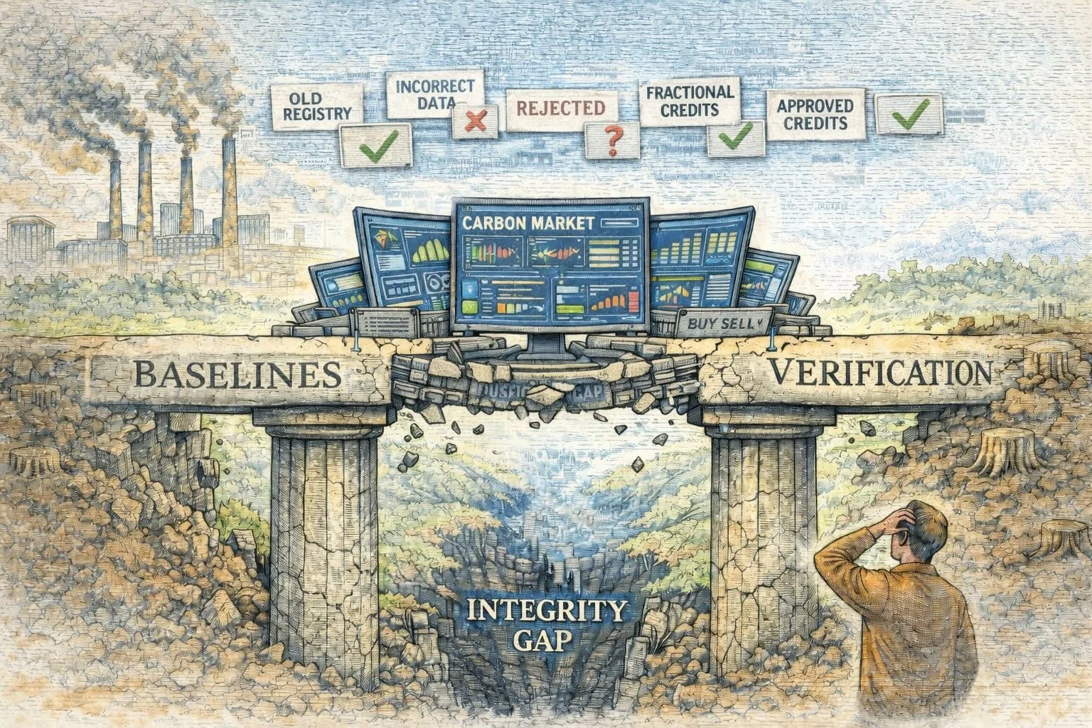 The illustration depicts a crumbling stone bridge labeled Baselines and Verification straining under the weight of glowing dashboards and automated carbon data systems, while smokestacks rise on one side and a scarred, deforested landscape stretches across the other, illustrating how digital platforms have accelerated measurement and trading without repairing the fragile foundations of market design—where flawed assumptions, rejected methodologies, and opaque approvals collapse faster when software amplifies them, leaving observers to confront the widening gap between technological speed and environmental credibility.