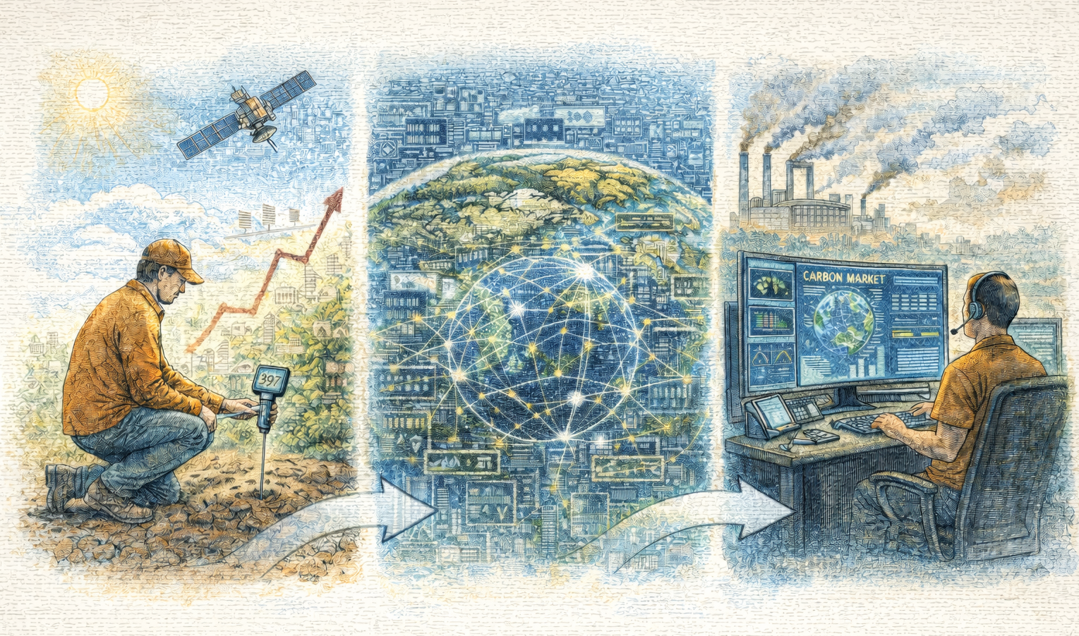 From left to right, the illustration traces the modern digital journey of carbon measurement and market visibility. On the left, a field technician kneels in agricultural soil, inserting a carbon sensor while satellite imagery and rising data charts hover overhead, symbolizing the shift from periodic site audits to continuous, technology-enabled measurement of emissions and sequestration. In the center, the planet is wrapped in glowing data networks layered over cities, forests, and infrastructure, representing the explosion of digital MRV systems that aggregate satellite feeds, sensor data, and project reports into real-time climate intelligence platforms. On the right, an analyst monitors carbon market dashboards filled with live emissions metrics, project performance indicators, and trading data, showing how raw environmental measurements now flow directly into digital accounting systems and market decision-making. Together, the sequence illustrates how technology has dramatically accelerated speed, expanded geographic scale, and increased visibility across carbon markets—transforming climate data from slow, paper-based reporting into continuous global digital infrastructure.
