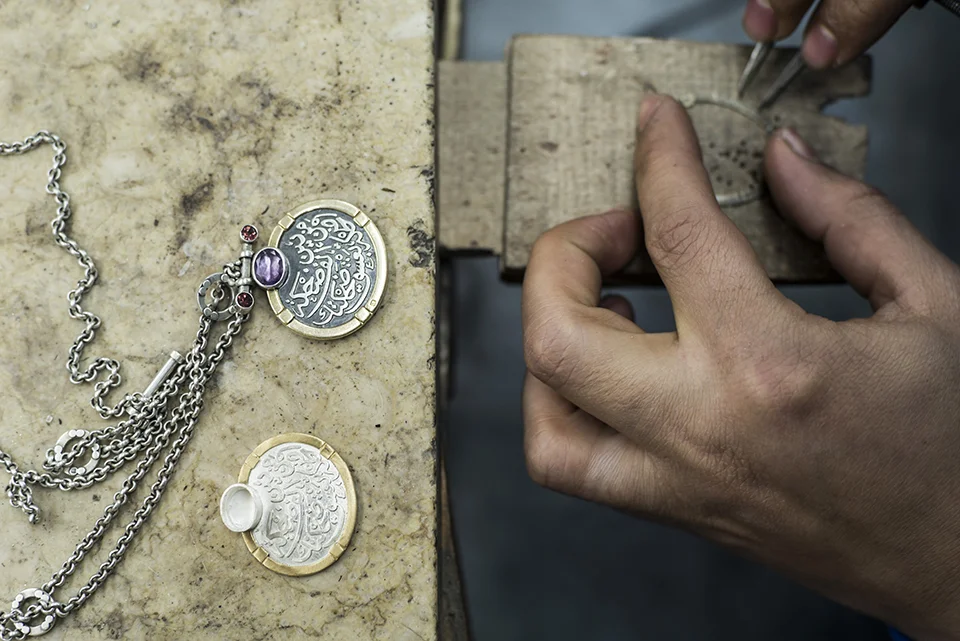 Today, the Azza Fahmy studio is mostly run by young Egyptian women, a remarkable achievement in the male-dominated workshops of the Khan El-Khalili. The school attracts international artists as both teachers and apprentices, and is known not only for being part of a global namesake brand of a successful woman entrepreneur but also for being grounded in decades of artistry meticulously inspired by Islamic, Egyptian, and Bedouin jewelry and crafts. Photo © OHK Consultants.