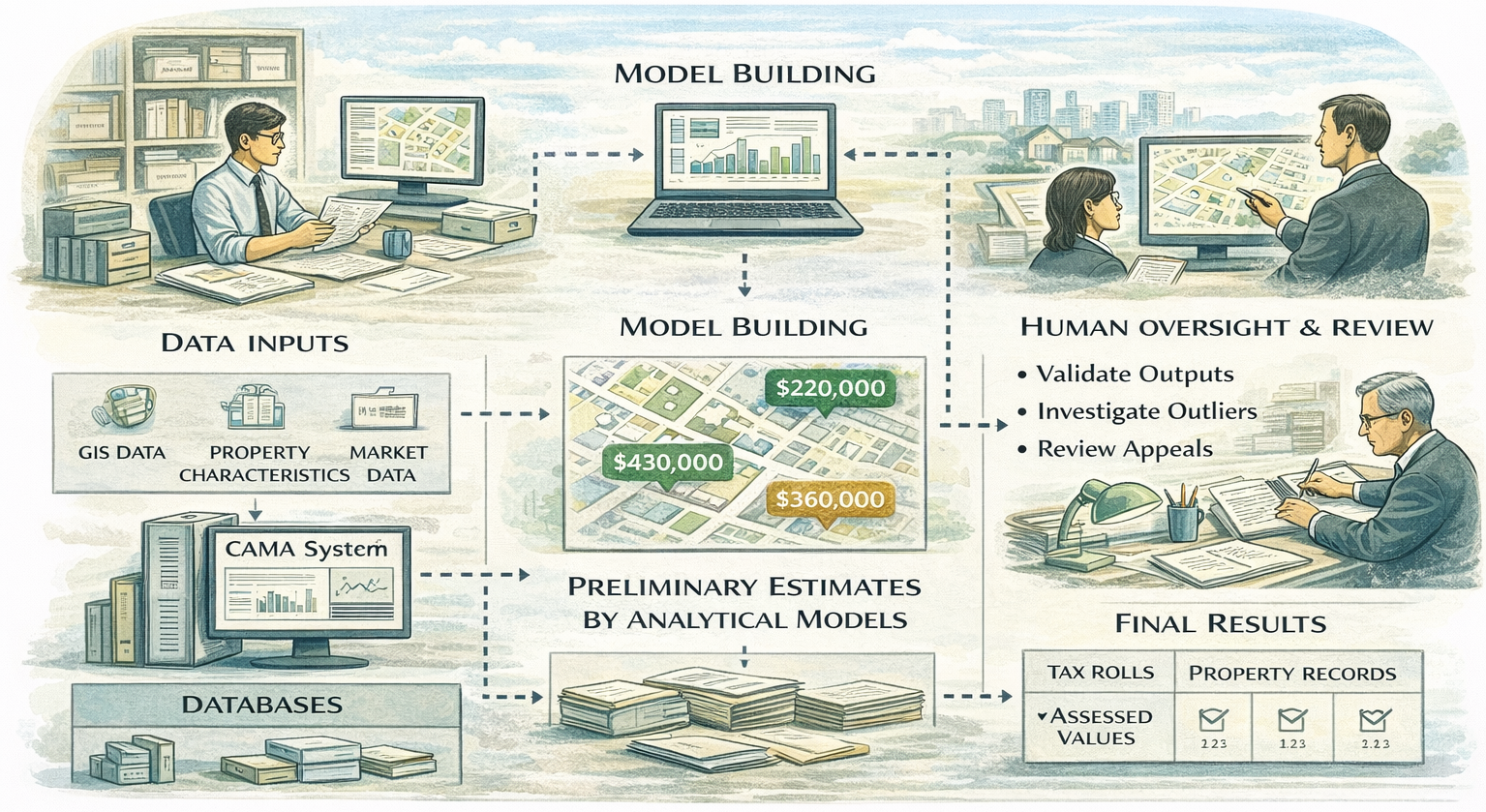 In these systems, analytical models generate baseline or preliminary values across large property sets, drawing on available spatial, legal, and market data. Human assessors then review outputs, investigate anomalies, validate assumptions, and manage exceptions and appeals. Automation accelerates repetitive processing and improves consistency, while human involvement preserves legitimacy, interpretability, and legal defensibility. This balance is not accidental; it reflects an understanding that valuation outcomes must be explainable and contestable within administrative and judicial processes.