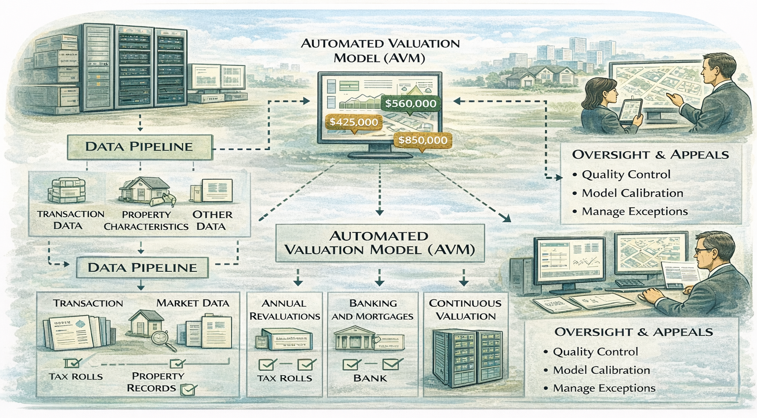 One common form of full automation is the national AVM pipeline, in which valuation authorities apply standardized models across broad property segments to support periodic—often annual—revaluations. These systems emphasize consistency and timeliness, enabling governments to maintain up-to-date tax bases without extensive manual intervention. Their success depends not only on model performance, but also on strong legal frameworks that define how automated values are issued, reviewed, and appealed.