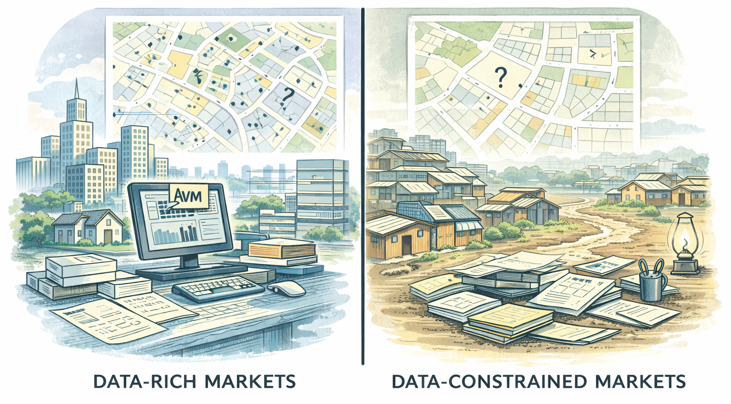In contrast, data-constrained or immature markets are characterized by sparse or unreliable transaction data, informal development, inconsistent parcel boundaries, and fragmented institutional data ownership. In these contexts, attempting to deploy sales-based or highly automated valuation systems often leads to unstable outputs that cannot be explained or defended. Instead, valuation approaches must rely on proxies, standardization, and conservative assumptions. Rules-based systems, land value zoning, reference parcels, and hybrid methods are commonly used to compensate for data gaps while maintaining consistency. The constraint is not the absence of data per se, but the lack of reliable, comparable, and accessible data at scale.