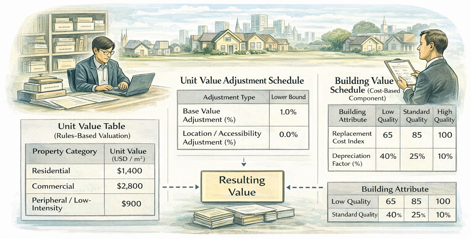 One common form of rules-based valuation is the unit value system, where properties are assigned values based on standardized rates per square meter of land or built area, differentiated by use, zone, or category. Unit value systems are straightforward to implement and scale, making them suitable where data on property attributes is available but transaction evidence is limited. Their effectiveness depends on the credibility of the underlying rate structure and the frequency with which rates are reviewed and updated. Without periodic recalibration, unit values can drift away from economic reality.